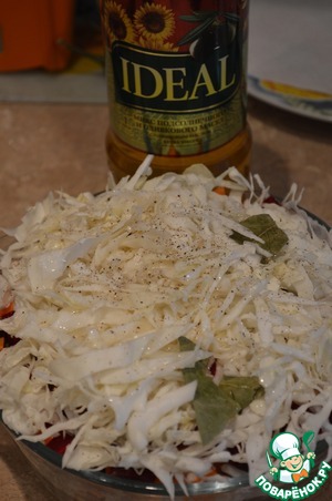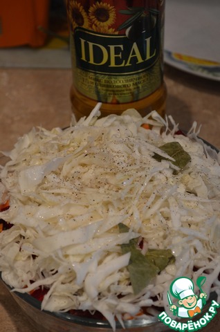 Капусту солим, перчим поливаем растительным маслом и кладем лавровый лист. Форму накрываем фольгой, закрываем крышкой и ставим в разогретую до 180*С духовку примерно на 1 час.