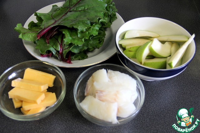 Большие свекольные листья моем, рыбу режем на небольшие кусочки, грушу на дольки, сыр на брусочки. Я делала 8 штук, поэтому у меня 8 листьев, 8 долек груши, 8 кусочков рыбы и 8 брусочков сыра.