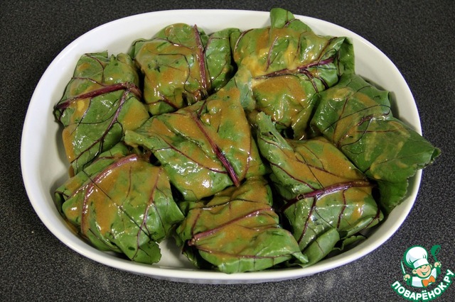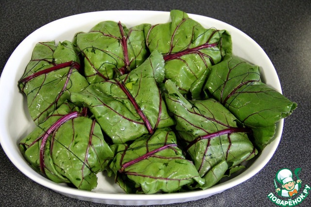 Заворачиваем лист свеклы конвертиком и перекрушиваем ниткой (нитку не завязываем, что бы ее легко можно было снять).