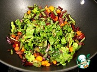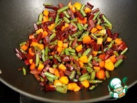 На сковороде ( у меня сковорода-вог ) потушить черешки свеклы, морковь и зеленую фасоль на растительном масле. Примерно 20-25 минут. |