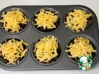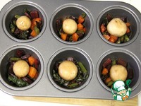 Форму для маффинов смазать растительным маслом и положить по 1 ст. ложки тушеных овощей. Сверху овощей кладем по 1 небольшому грибочку. |