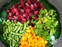Черешки свекольных листьев и зеленую фасоль мелко порезать, морковь порезать на мелкие кубики, а листья свеклы порвать. |