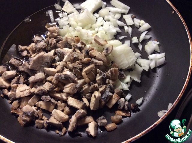Теперь приступает к фаршу. В сковороде пережариваем в небольшом количестве масла шампиньоны и репчатый лук. Солим и перчим по вкусу.