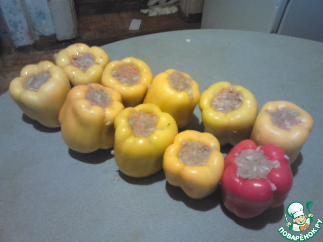 • Набиваем наши перчики фаршем и выкладываем в кастрюлю в вертикальном положении. Оставшийся фарш я добавляю в соус
