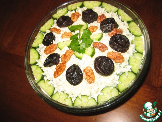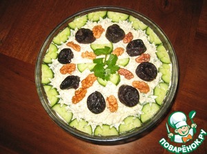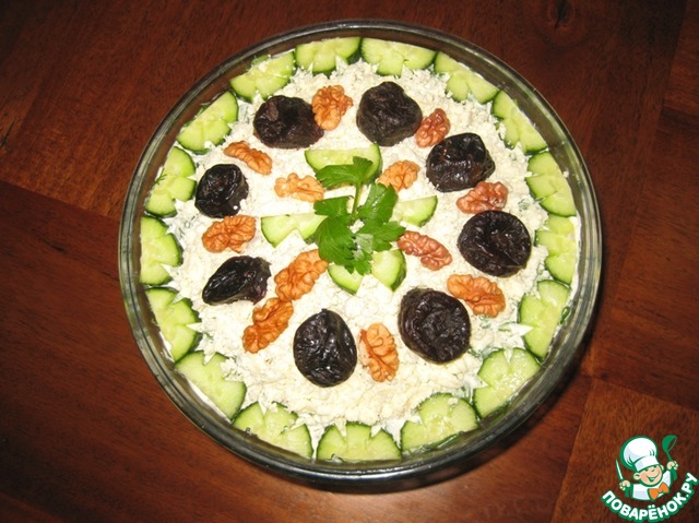• Начинаем украшать салат. Огурцы нарезаем кружочками и половинками, вырезаем треугольнички и раскладываем по краю салатника. Желтки измельчаем вилкой и посыпаем ими центр салата. Теперь украшаем салат орехами и черносливом. Точно также этот салат оформлен и в книге с которой я его взяла, только в центр я добавила веточку зелени, огурцов и орехов.