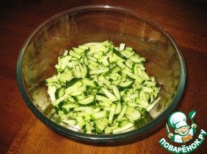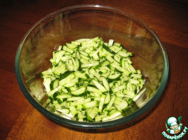 • На дно салатника уложите нарезанные соломкой огурцы. По оригинальному рецепту огурцы предварительно очищают от кожуры. Я так делала, но в моей семье "прижились" неочищенные огурцы. Да, я немного их солю. Сверху промазываем тонким слоем майонеза. Не забудьте оставить огурцы для украшения.