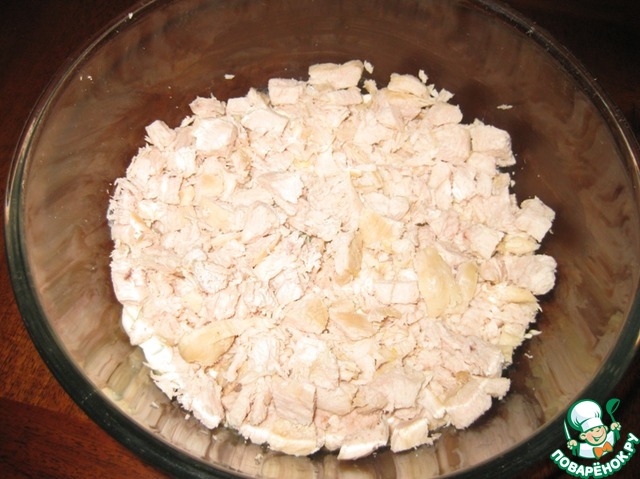 • Куриную грудку нарезать соломкой или кубиками и уложить следующим слоем. Промазать майонезом.