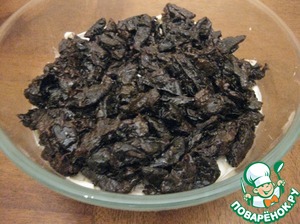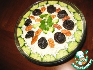 • С чернослива слить воду. Выбрать несколько красивеньких штук для украшения салата, остальное нарезать соломкой и уложить сверху курицы, промазав потом майонезом.