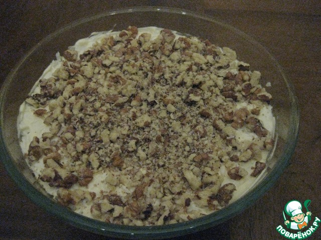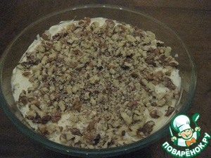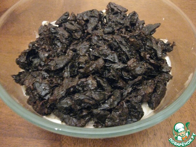 • Из орехов выбрать несколько красивых половинок для украшения салата, а остальные измельчить, но не очень мелко. высыпать их сверху чернослива. Можно не промазывать майонезом, но я промазываю.