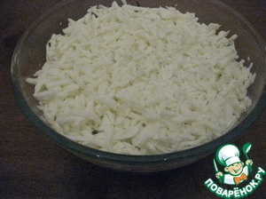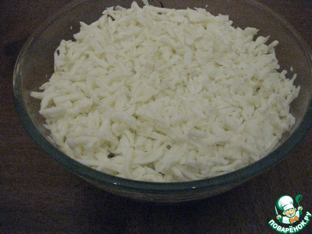 • Вареные яйца разделим на желтки и белки. Белки нужно нарезать соломкой, но я просто тру на крупной терке. Уложим их сверху чернослива и промажем майонезом. Желтки же пойдут у нас на украшение салата, поэтому отставим их пока.