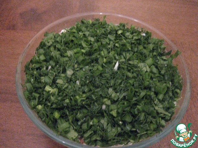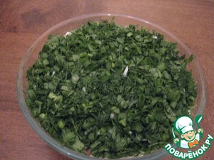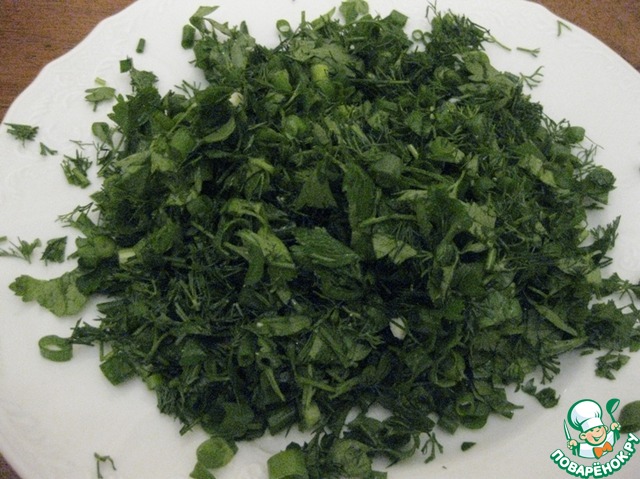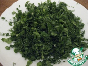 • Зелень и зеленый лук измельчить и перемешать в какой-нибудь отдельной посуде.
