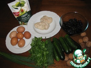 • Приготовим все продукты. Куриную грудку сварить. Я варю ее с добавлением 1 куриного кубика "Кнорр", на мой взгляд так вкуснее. Можно не варить, а обжарить. Яйца отварить. Орехи поколоть. Я не покупаю готовые орехи, т. к. у нас всегда есть свои.