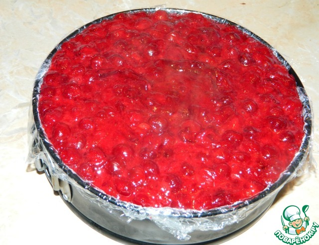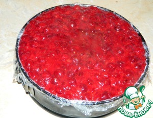 • Для вишневого слоя вишню разморозить, добавить остальные ингредиенты, перемешать и поставить греться, постоянно помешивая. Нагревать до густоты.