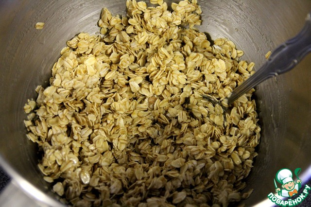 Добавтиь овсяные хлопья и хорошо перемешать, что бы все хлопья покрылись маслом с медом.