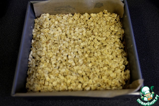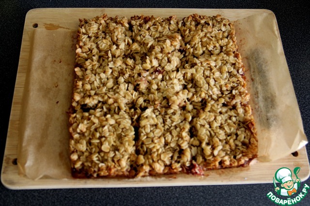 Затем вынуть из духовки, дать немного остыть и разрезать на квадраты или прямоугольники.