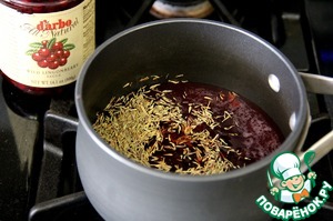 Сначала готовим соус. Для этого в небольшой кастрюле смешиваем брусничный соус, бальзамический уксус, мед, сахар, тимьян и 1/2 ч. л. соли и кипятим на медленном огне в течении 5 минут.