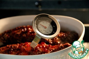 С помощью специального термометра измеряем температуру мяса. Свинина готова, когда температура внутри мяса 80С (160F ). -