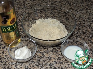 Предлагаю приготовить песочное тесто на основе подсолнечного масла с добавлением оливкового ТМ "IDEAL" (основа пирога по вкусу ничуть не уступает тесту на сливочном масле). Просеянную муку смешать с разрыхлителем, солью и сахаром по вкусу (я добавила 1 ст. ложку сахара и 1/2 ч. ложки соли). Влить масло и перетереть руками до состояния крошки.