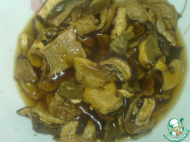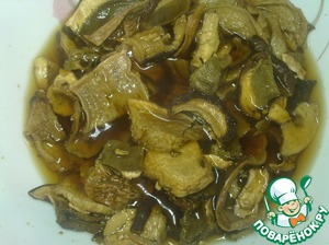 • В горячей воде предварительно замачиваем белые грибы, в течение 10 минут. (Воду после замачивания грибов не выливать, она нам понадобится.)