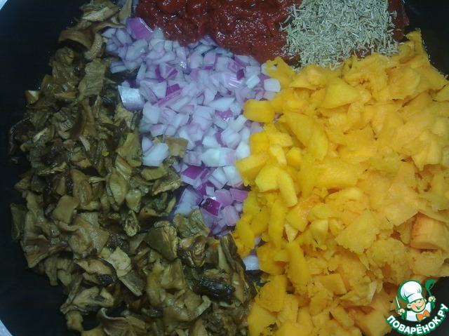 • Теперь режем мелко луковицу, а также измельчаем грибы. Всё выкладываем на сковороду, добавляем измельченную тыквенную мякоть, томатную пасту, розмарин. Готовим эту смесь в течение 7 минут.