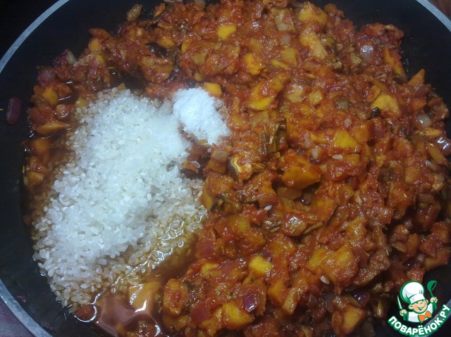 • Затем наливаем в сковороду 0,5 стакана воды, в которой замачивали грибы, добавляем рис и соль. Всю массу хорошо перемешиваем.