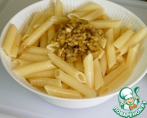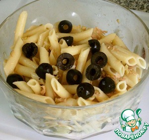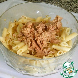 Затем слить масло из банки с тунцом, немного поломать на кусочки и добавить к пасте.