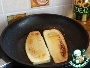 Кабачок порезать тонкими слайсами вдоль и обжарить на масле, чуть подсолив с обоих сторон;