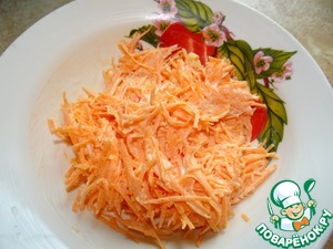 Морковь натереть на мелкой терке, добавить рубленный чеснок, майонез, перемешать;