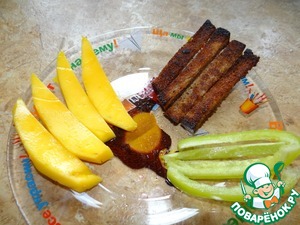 Закуска из кабачка с чесночной морковной начинкой, манго и сухариками. Вкусная и красивая закуска из кабачка в сочетании с чесночной морковкой, сладким манго, хрустящим хлебцем и перцем - несомненно украсит ваш стол и придется по вкусу гостям!