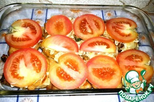Поверх лука на каждый кусочек сома ложим кружок помидора. -