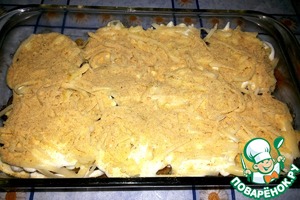 Затем обваливаем кусочки филе в панировочных сухарях и быстро обжариваем на раскаленном масле до образования румяной золотистой корочки. Выкладываем обжаренную рыбку в форму для запекания. -