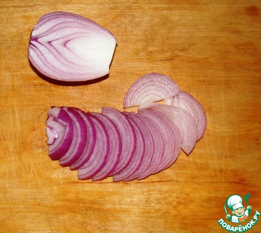 Первым делом нарежем лук полукольцами и замаринуем его в уксусе с сахаром.