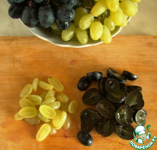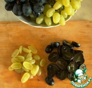 Виноград вымоем и разрежем на половинки. Если есть косточки - удалим их.