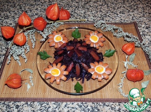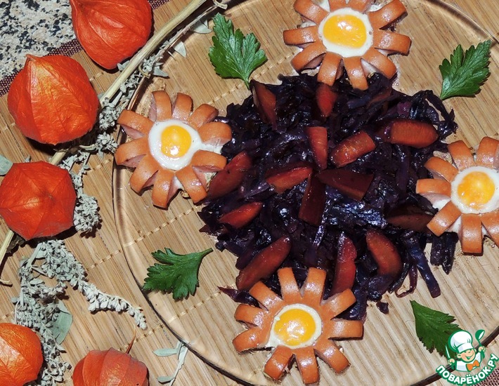 Предлагаю приготовить на ужин очень вкусный гарнир из краснокочанной капусты со сливами. Может, это сочетание и вам покажется идеальным! А с капустой - конечно же, сосиски (придайте им веселого солнечного настроения). Такой ужин заставит улыбнуться и в хмурый осенний вечер.