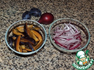 Пока тушится капуста, лук нарезать перьями, сливы - дольками.