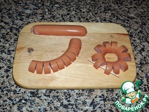 Сосиски разрезать вдоль пополам. Сделать поперечные надрезы, соединить в кольцо и скрепить зубочисткой.