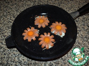 Выложить сосисочные "цветочки" на нагретую сковороду, в серединку вылить по перепелиному яйцу. Жарить до готовности яиц.
