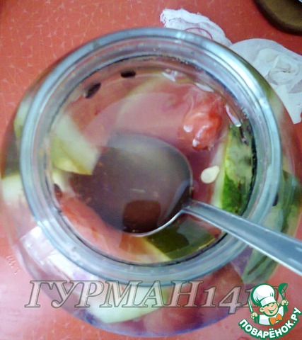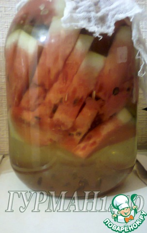 Залила арбуз кипящим рассолом. Когда остынет, несколько раз в день опускаем ложкой верхние кусочки арбузов в рассол. -