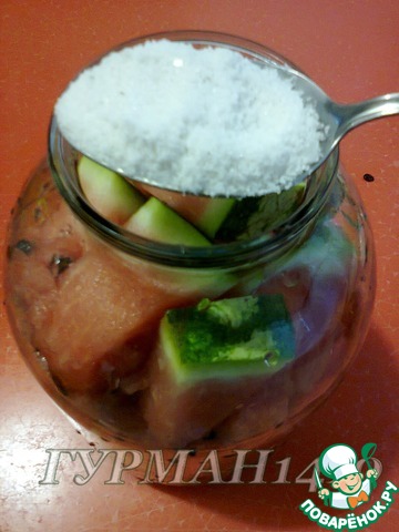 Арбуз порезала в трехлитровую банку, залила холодной кипяченой водой до краев банки, потом слила воду в кастрюлю, добавила соль, сахар и довела до кипения.
