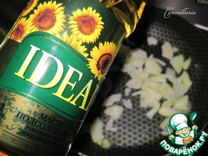 • На сковороде разогреть растительное масло, обжарить мелко нарезанный репчатый лук.