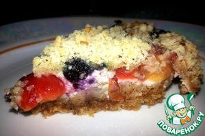 В форму для выпечки высыпаем половину теста-крошки, сверху распределяем равномерно творожную начинку и выкладываем сверху ягоды: сливы (разрезанные вдоль), чернику, малину. Засыпать оставшимся тестом-крошкой.