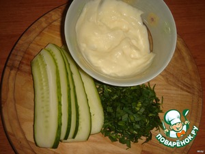 Подготовьте соус – майонез, смешанный с раздавленным чесноком, а также измельчите зелень и порежьте вдоль огурец тоненькими пластинами.