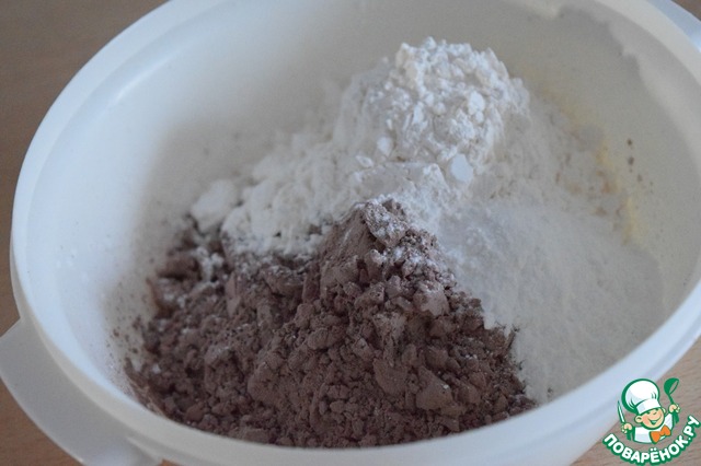 Смешать два вида пудинга и разрыхлитель теста, просеять.