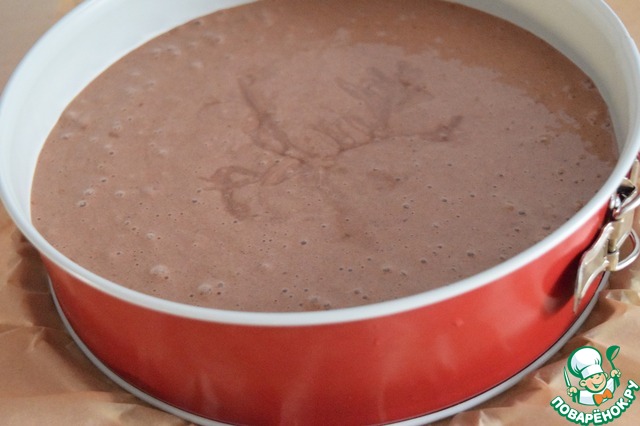 Дно круглой формы ( д. 26 см ) застилаем бумагой для выпечки, стенки формы ничем не смазываем и выливаем наше тесто.