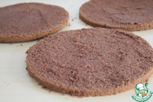 Разрезаем бисквит вдоль на 3 части.