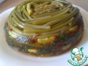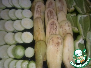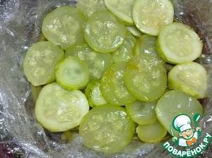 Теперь берем форму для приготовления овощного торта, застилаем пищевой пленкой и слоями выкладываем запеченные овощи в произвольном порядке. На дно формы по кругу я выложила маринованную черемшу, на нее запеченные кабачки.