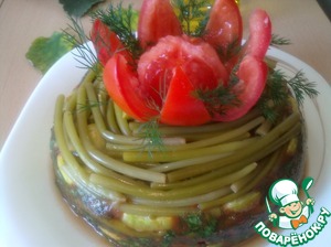 Закрываем овощи оставшимися концами пищевой пленки, сверху накрыть тарелкой и поставить на нее груз. Ставим торт в холодильник на 20-30 минут.
