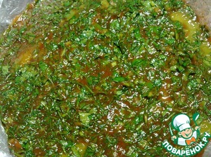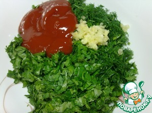 Тем временем готовим заправку, зелень ( у меня кинза и укроп) мелко рубим, чеснок пропускаем через пресс, соединяем с кетчупом, добавляем соль и винный уксус. Все хорошо перемешать.