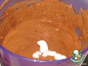 Взбить желтки с сахаром и творогом, добавить сметану, шоколад и желатин. В конце вмешать взбитые в пену белки.