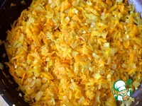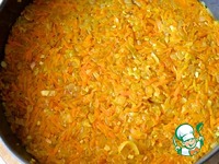 3. Лук и чеснок мелко порезать, оставшуюся морковь потереть на крупной терке. Потушить лук в растительном масле до прозрачности. Добавить морковь, готовить на среднем огне еще 10 минут и всыпать мелко рубленный чеснок. Размешать и прогреть еще минуту.